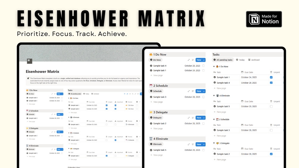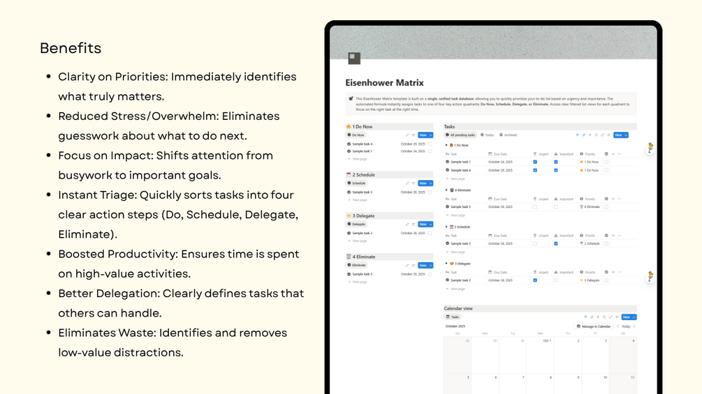 The template gives you instant clarity through four distinct, filtered list views, ensuring you focus on the right tasks at the right time. Your tasks are categorized into clear action zones: 🔥 Do Now (Crisis tasks), 🗓️ Schedule (Goal-driving tasks for deep work), 🤝 Delegate (Interruption tasks others can handle), and 🗑️ Eliminate (Low-value distractions to cut). This structure ensures your energy is strategically channeled away from busywork and toward high-impact activities that truly move your personal and professional life forward.