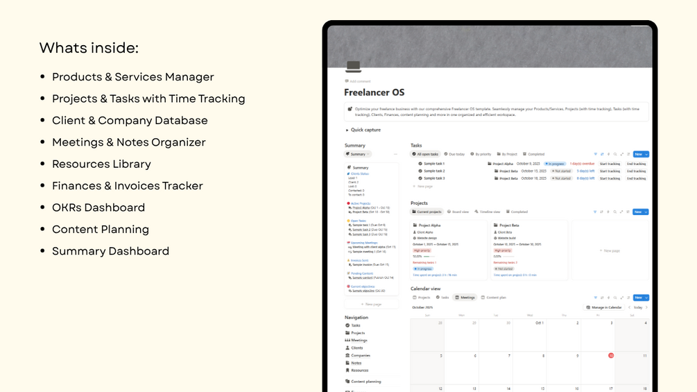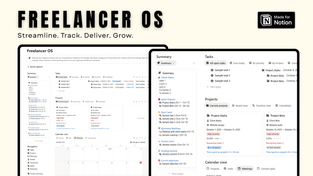 Freelancer OS isn’t just a workspace — it’s your business command center. By bringing everything under one roof, it eliminates chaos, improves organization, and helps you stay on top of deadlines and deliverables with confidence. From client management to content strategy, you’ll have a clear, data-driven view of your freelance growth.